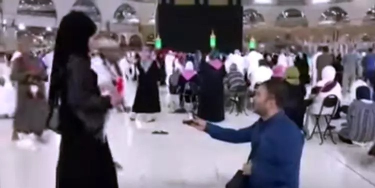 أظهر مقطع فيديو، شابا يعرض الزواج على فتاة أمام الكعبة المشرفة. وعبر متداولو المقطع على مواقع التواصل الاجتماعي عن استيائهم من تصرف الشاب الذى يبدو من لهجته أنه تركي، وإقدامه على تقديم خاتم الزواج وهو جالس على ركبتيه، لفتاة أمام الكعبة المشرفة، معتبرين أن ما فعله الشاب والفتاة يتنافي من قدسية الحرم الشريف.