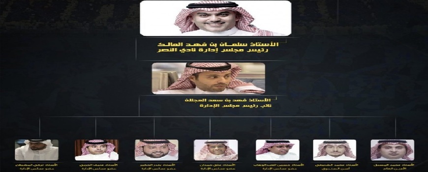 اعتمد رئيس الهيئة العامة للرياضة تركي آل الشيخ، اليوم الثلاثاء (16 يناير 2018م)، تشكيل مجلس إدارة نادي النصر الجديد، وجاء تشكيل المجلس الجديد سلمان المالك رئيساً، وفهد العجلان نائباً للرئيس، ومحمد المسبل أميناً عاماً للمجلس، ومحمد الشنيفي أميناً للصندوق، وعضوية كلاً من حسين العبدالوهاب، وبندر الحكير، ومنيف الحربي، وتركي المشيقح.