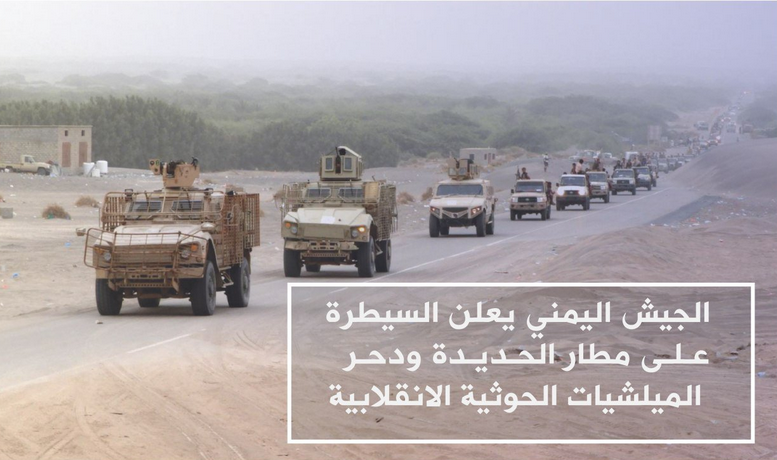 وأكد المركز الإعلامي للجيش اليمني عبر حسابه الرسمي في موقع “تويتر” أن قوات الجيش اليمني مدعومة من قوات التحالف العربي والمقاومة اليمنية تمكنت من تحرير مطار الحديدة الدولي من قبضة ميليشيات الحوثي، التي تعاني – وفق مصادر يمنية – من خسائر فادحة وسط محاولات من قادتها لتأمين خروج سريع من باقي مناطق الحديدة.