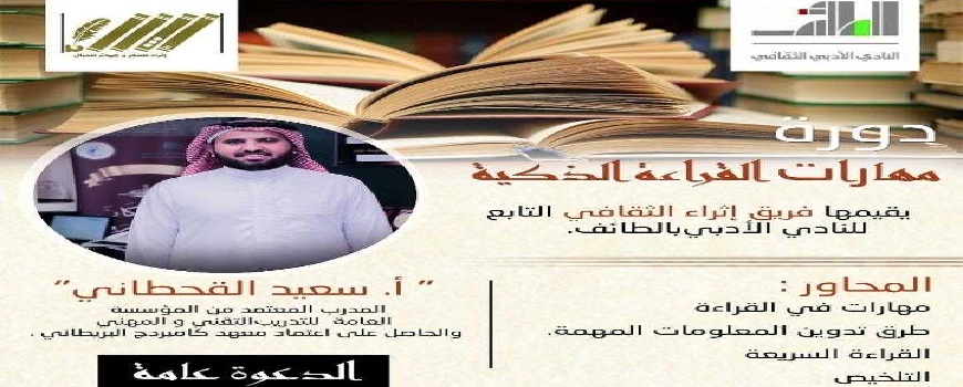 ينظم النادي الأدبي الثقافي بالطائف، الثلاثاء القادم (31 يوليو 2018م)، دورة مهارات القراءة الذكية ضمن أنشطة فريق إثراء الثقافي بالنادي.
