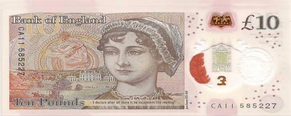 تحمل هذه الورقة النقدية الإنجليزية رسمة للمؤلفة الشهيرة جين أوستن، التي ولدت في ستيفنتون هامبشير، وعاشت معظم حياتها في تلك المنطقة.
