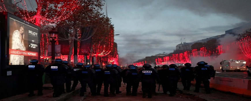 استخدمت الشرطة الفرنسية، الغاز المسيل للدموع وخراطيم المياه، خلال اشتباكها مع آلاف المحتجين الغاضبين من ارتفاع تكاليف الوقود والسياسات الاقتصادية للرئيس إيمانويل ماكرون، في ثاني مطلع أسبوع يشهد احتجاجات أصحاب (السترات الصفراء) في أنحاء فرنسا.