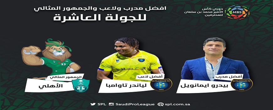 حصل البرتغالي بيدرو إيمانويل، مدرب نادي التعاون، على جائزة أفضل مدرب في الجولة العاشرة من دوري كأس الأمير محمد بن سلمان للمحترفين، فيما حصد لاعبه الكاميروني لياندر تاوامبا على جائزة أفضل لاعب في الجولة.