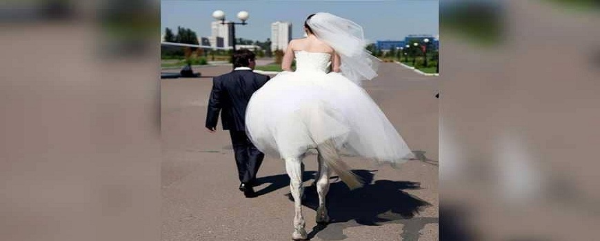 غير أن المصور تواجد في المكان المناسب لتظهر الصورة وكأن أطراف الفرس الخلفية مكملة لجسم العروس على ظهره.