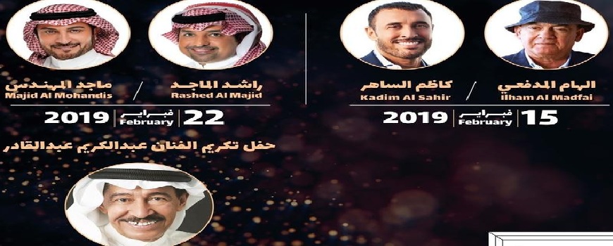 وستشهد حفلات المهرجان، إطلالة كبيرة للقيصر كاظم الساهر والمطرب إلهام المدفعي يوم 15 شباط/ فبراير، وحفلة مرتقبة للنجمين راشد الماجد وماجد المهندس يوم 22 شباط/ فبراير، وسيقيم المهرجان تكريماً للفنان عبدالكريم عبدالقادر.