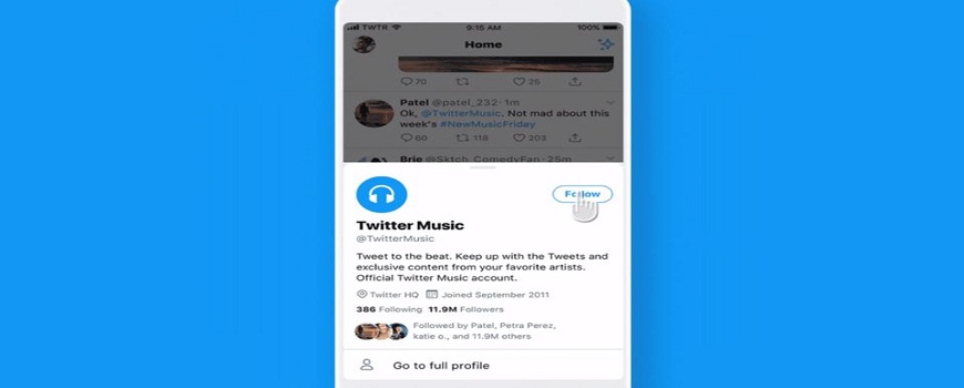 أعلنت شركة «تويتر»، الأربعاء (13 فبراير 2019م)، أنها تختبر حاليًا ميزة جديدة تسمح للمستخدمين بالاطلاع على الملفات الشخصية للمستخدمين الآخرين دون الحاجة إلى مغادرة الخط الزمني.