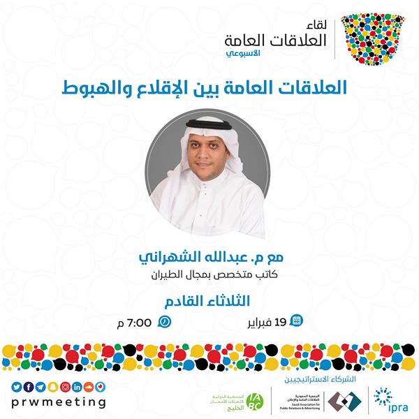 تستضيف مبادرة “لقاء العلاقات العامة” هذا الأسبوع مدير العلاقات العامة في السعودية لهندسة وصناعة الطيران، نائب رئيس اللجنة الدولية لحل النزاعات بين شركات الطيران والمطارات (IATA) سابقاً المستشار م. عبد الله الشهراني، ليتحدث عن (العلاقات العامة بين الإقلاع والهبوط) أهمية العلاقات العامة في صناعة الطيران، وذلك مساء الثلاثاء 19 فبراير 2019م في ملتقى العمل في مدينة الرياض (The Work Hub).