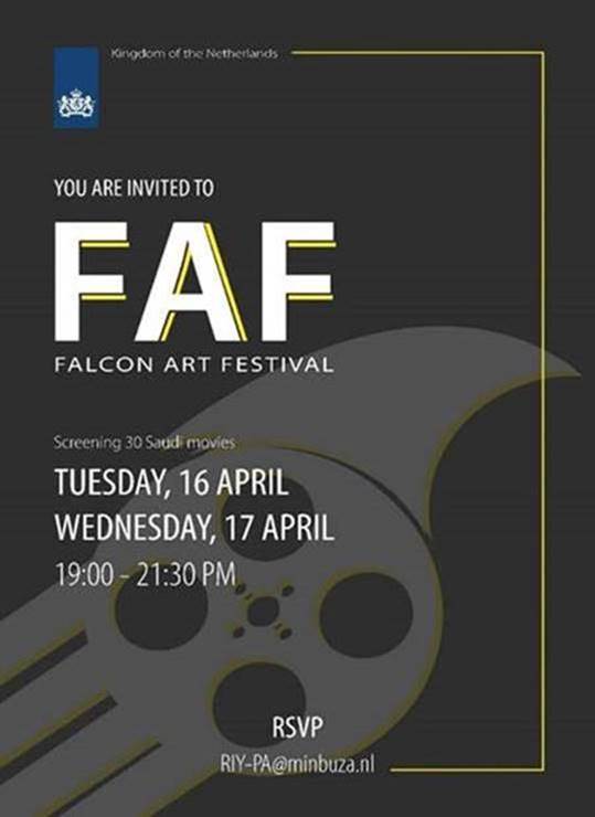 أعلنت سفارة مملكة هولندا لدى المملكة، عن انطلاق مهرجان الصقر للفنون، وذلك يومي الثلاثاء والأربعاء 16-17 إبريل الجاري، في مقر السفارة بالرياض، وسوف يقوم المهرجان الفريد خلال يومين بعرض أكثر من 30 فيلم سعودي. كما سيكون هناك عرض خاص للغرافيتي الكتابة على الجدران، إضافة إلى فعاليات أخرى متنوعة، وحفل توزيع الجوائز خلال اليوم الثاني من المهرجان.