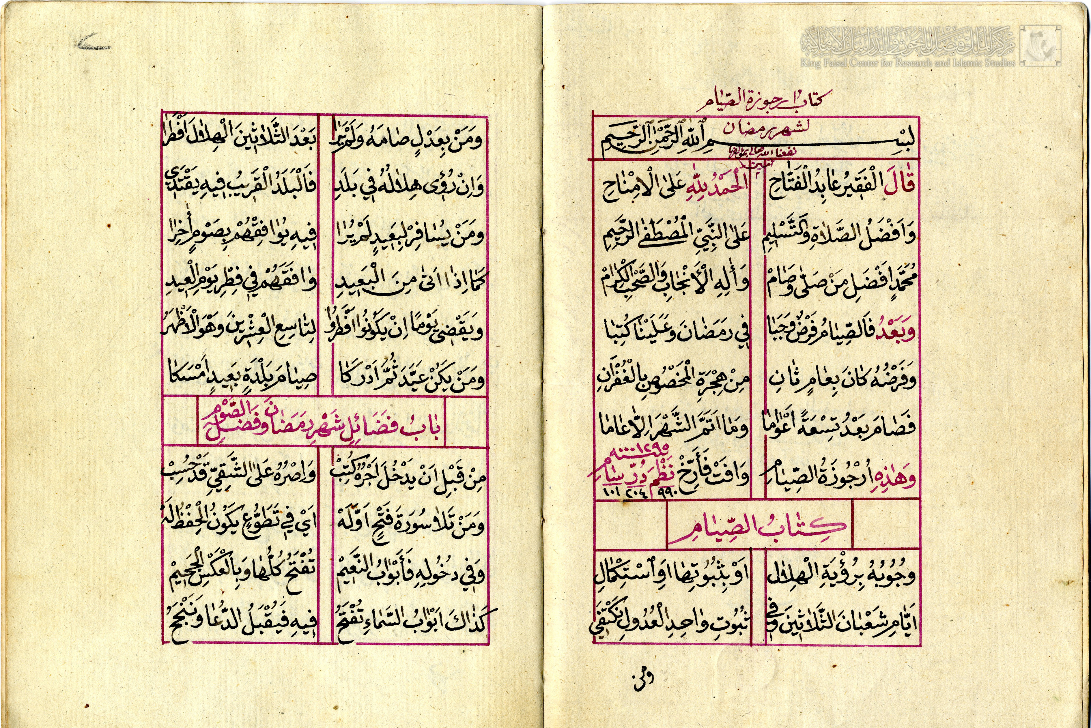 إن من أجلّ ما حملته لنا المخطوطات، ومن أدقّ ما خطّته أنامل العلماء والأدباء، تلكم الأبيات الموزونة، والأشعار السلسة الرائقة، التي قُصد بها تقريب العلوم واختصارها، وحصر المسائل وتهذيبها، والتي يُطلق عليها في ميزان الشعر بـ”الأراجيز” أو: “الأرجوزات”. وإن ما دُوِّن منها ممّا هو محفوظ في المخطوطات الإسلامية أكثر من أن يُحصر. وتتفاوت تلك “الأراجيز” طولا وقصرا، فمنها ما نظم كتبًا بأكملها، ومنها ما نظم أبوابًا خاصّةً من العلوم والفنون، كـ”أرجوزة الصيام لشهر رمضان“، التي نظمها العالم الأديب عبد الفتّاح بن مصطفى المحمودي اللاذقي (ت بعد 1297هـ)، وجمع فيها كل ما يختصّ بهذه العبادة العظيمة التي يطلّ علينا شهرها الكريم، وجعلها في تسعة عشر بابا وخاتمة. ويحتفظ مركز الملك فيصل للبحوث والدراسات الإسلامية بمخطوطة المؤلّف التي بخطّه من هذه الأرجوزة الجميلة.