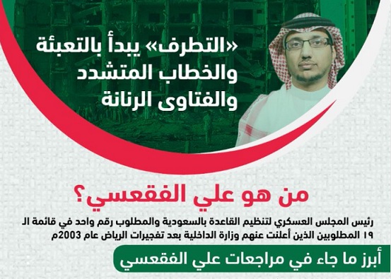 نشرت الإدارة العامة لمكافحة التـطرف برئاسة أمن الدولة، أبرز ما جاء في مراجعات علي الفقعسي، القيادي السابق في تنظيم القاعدة بـالسعودية والمطلوب رقم واحد في قائمة الـ19 مطلوبًا أمنياً الذين أعلنتها وزارة الداخلية بعد تفجـيرات الرياض عام 2003م.
