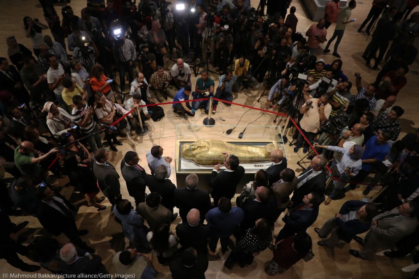 صحفيون تجمعوا حول التابوت الذهبي للكاهن نجيمانخ، وهو كاهن رفيع المستوى في القرن الأول قبل الميلاد، والذي يُعرض الآن في المتحف الوطني للحضارة المصرية في القاهرة بعد أن أعادته السلطات الأميركية إلى مصر. (© Mahmoud Bakkar/picture alliance/Getty Images)