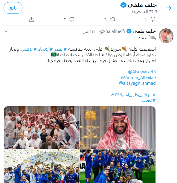 وقد أطلق الكاتب والإعلامي الرياضي خلف ملفي، هذا التساؤل في تغريدته في موقع تويتر مساء أمس الأربعاء (27 نوفمبر 2019م)، معبرا عن ذلك بقوله: “وااااأسفاه..!”، ومضيفا عن هذا التصرف بقوله: “استعصت كلمة مبروك على أندية منافسة النصر، الاتحاد، الاهلي بإنجاز تجاوز صداه أرجاء الوطن وواكبه احتفالات رسمية صاخبة”. ومشيرا بالوقت نفسه إلى أن هذا الأمر هو بمثابة “اختبار وعي تنافسي فشل فيه الرؤساء الجدد بضعف قيادي!!”.