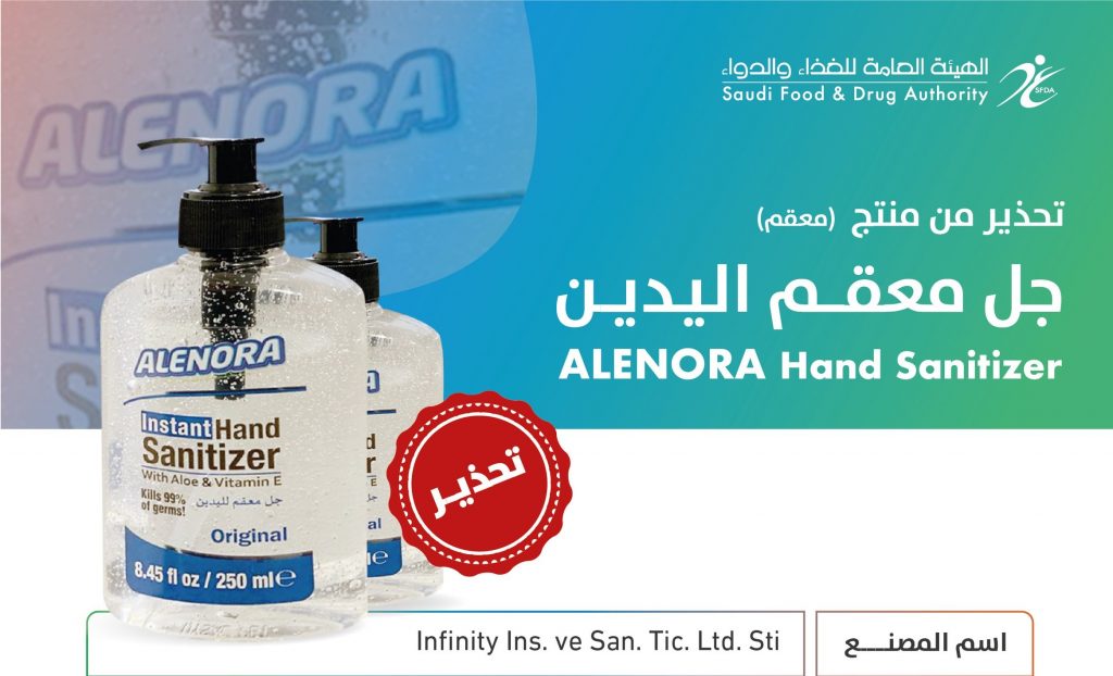 ويحمل المعقم الأول اسم “Alenora hand Sanitizer” من إنتاج مصنع Infinity Ins. ve San. Tic. Ltd. Sti في تركيا، ويشمل التحذير جميع التواريخ والتشغيلات.