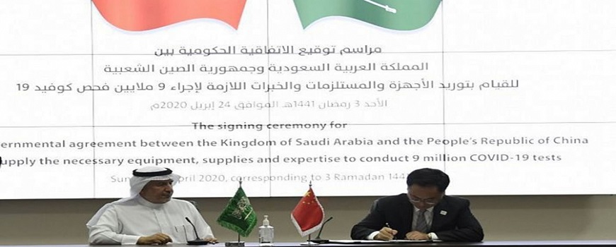 وقعت المملكة ممثلة بمركز الملك سلمان للإغاثة والعمل الإنساني، عقدًا مع الصين بقيمة 995 مليون ريال لإجراء 9 ملايين فحص لفيروس كورونا المستجد، وذلك إنفاذًا لتوجيهات خادم الحرمين الشريفين الملك سلمان بن عبدالعزيز، وولي العهد الأمير محمد بن سلمان.