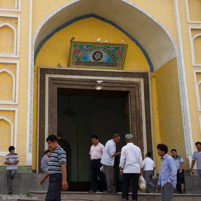تمت إزالة لوحة مسجد هيتكاه، التي تظهر في الصورة، كجزء من حملة القمع التي تشنها الحكومة الصينية على الإيغور. (© Epel/Shutterstock)