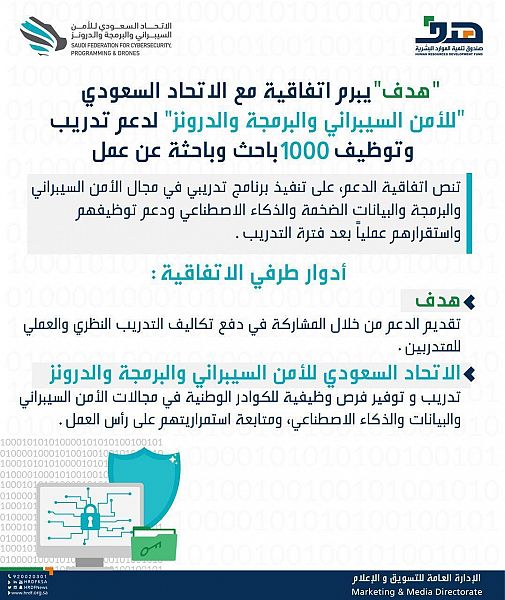أبرم صندوق تنمية الموارد البشرية “هدف” والاتحاد السعودي للأمن السيبراني والبرمجة والدرونز، اتفاقية تعاون لدعم تدريب وتأهيل وتطوير مهارات الكوادر الوطنية في مجال الأمن السيبراني والبرمجة والبيانات الضخمة والذكاء الاصطناعي، وتأهيلهم لشغل وظائف في القطاع الخاص، وضمان استقرارهم وظيفياً بعد إتمام فترة التدريب.