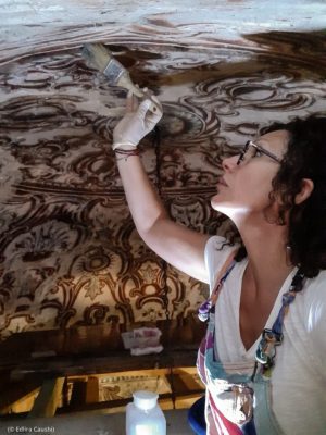 الخبيرة الفنية إدليرا كاوشي تعمل على اللوحات الجدارية في تكا دولمي في كروجي، ألبانيا. (© Edlira Caushi)