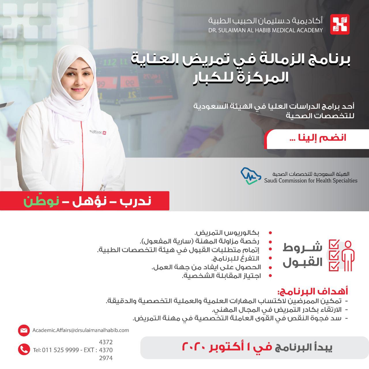 أعلنت أكاديمية د. سليمان الحبيب الطبية عن اعتماد برنامج الزمالة في تمريض العناية المركزة للكبار ، والمقرر أن يبدأ أوائل شهر أكتوبر المقبل ، وذلك تحت مظلة الهيئة السعودية للتخصصات الصحية . ويأتي تنفيذ هذا البرنامج بهدف الإرتقاء بالكوادر التمريضية الوطنية وتطوير قدراتها وإكسابها المهارات العلمية والعملية التخصصية بالعناية المركزة . فقد أثبتت الظروف الحالية لجائحة كورونا أهميتها البالغة والحاجة الماسة لها من أجل مساندة المرضى.