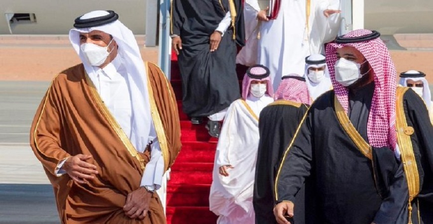 الأمير محمد بن سلمان مستقبلاً أمير قطر تميم بن حمد في مطار العلا
