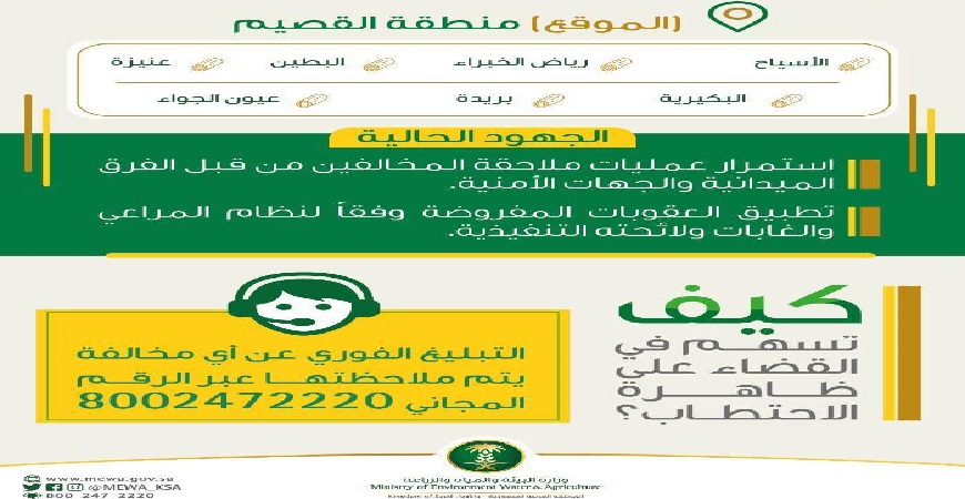 وأهابت وزارة البيئة والمياه والزراعة، بالمواطنين والمقيمين، بالتبليغ الفوري عن أي مخالفة يتم ملاحظتها عبر الرقم المجاني 8002472220.