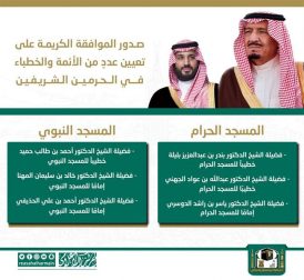 وأضافت أن الموافقة تضمنت أيضا تعيين الشيخ الدكتور أحمد بن طالب حميد خطيباً للمسجد النبوي، فيما عُين كل من الشيخ الدكتور خالد بن سليمان المهنا والشيخ الدكتور أحمد بن علي الحذيفي إمامين للمسجد النبوي.
