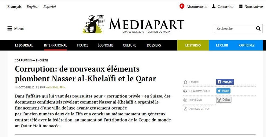 كشف تحقيق مطول لصحيفة «ميديا بارت» الفرنسية، للكاتب يان فيليبان، عن تفاصيل جديدة عن فساد قطر، متمثل في ناصر الخليفي، رئيس «بي إن سبورتس» BeIN Sports، وكيفية تسهيل حصولها على تنظيم كأس العالم من خلال رشوة أحد كبار مسؤولي الفيفا السابقين، وهو جيروم فالكي، الذي كان الرجل الثاني في الفيفا سابقاً.
