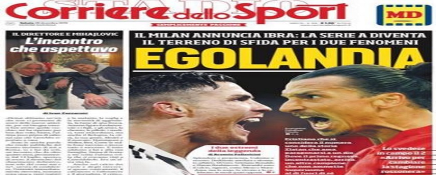 فيما خرجت صحيفة «كوريري ديللو سبورت»، بعنوان: “ميلان يعلن ضم إبرا: الدوري الإيطالي يصبح ساحة لمعركة بين اثنين من اللاعبين الهائلين، كريستيانو يعتبر نفسه رقم واحد في التاريخ، وزلاتان يحب اعتبار نفسه فوق الجميع”.