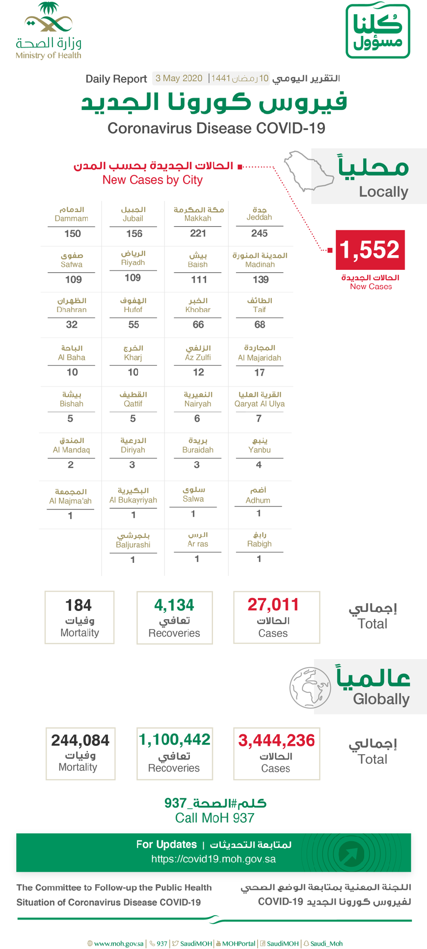 أعلن المتحدث الرسمي لوزارة الصحة د. محمد العبدالعالي، الأحد «الثالث من مايو 2020م»، عن تسجيل «1552» إصابة جديدة، ليصل إجمالي الإصابات إلى 27011 حالة، بالإضافة إلى 22693 حالة نشطة منها 139 حرجة.