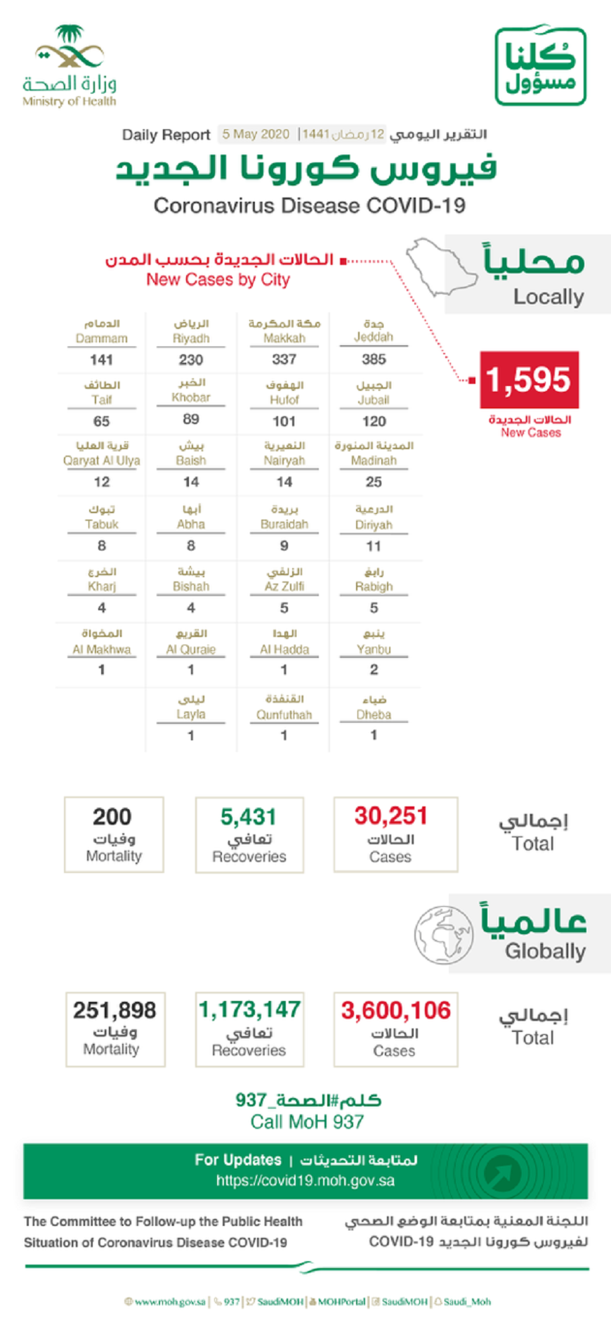 1595 إصابة جديدة بكورونا وتعافي 5431 بالمملكة