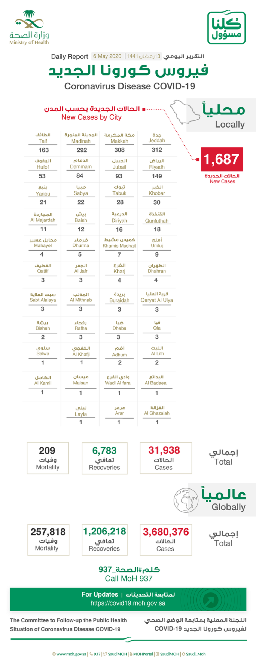 أعلنت وزارة الصحة، الأربعاء «السادس من مايو 2020م»، عن تسجيل 1687 إصابة جديدة بفيروس “كورونا” خلال يوم أمس «الثلاثاء»، ليصل إجمالي الإصابات بالفيروس إلى 31938 إصابة، منهم 27% مواطنين و 73% أجانب.