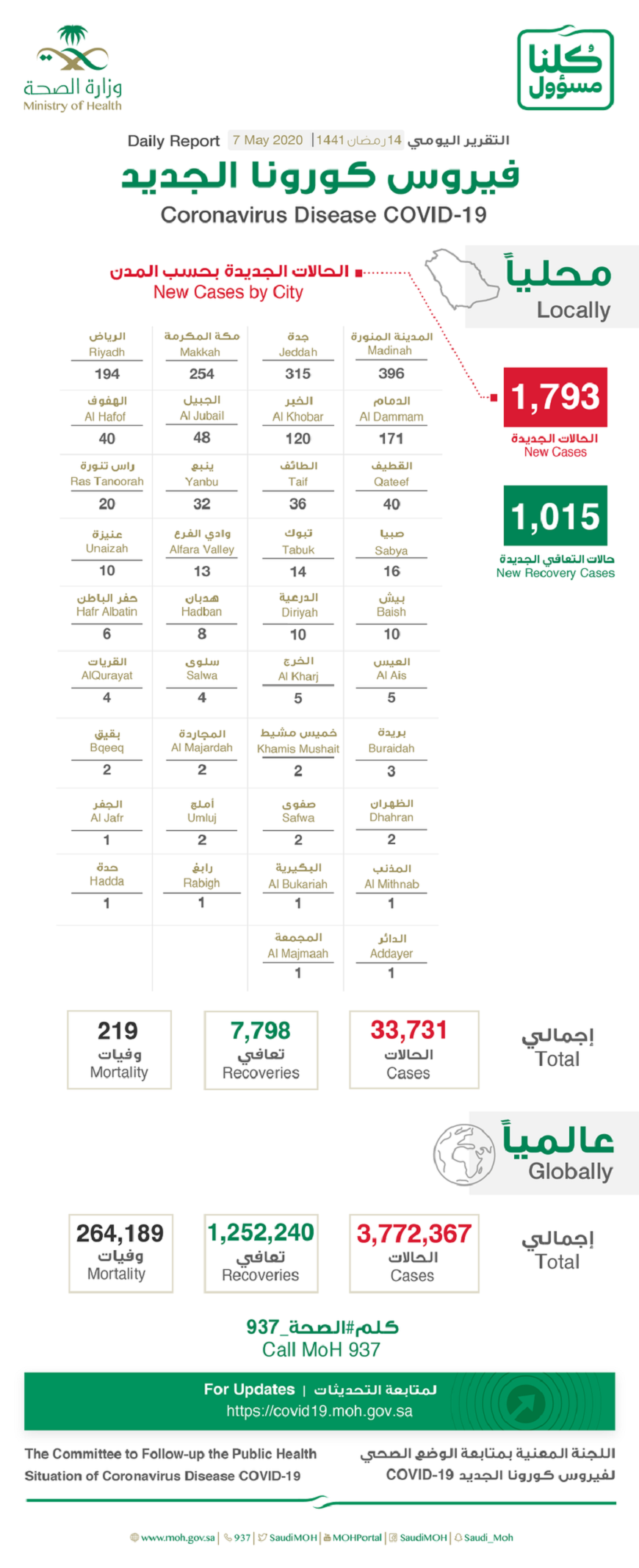 أعلنت وزارة الصحة، الخميس «السابع من مايو 2020م»، عن تسجيل 1793 إصابة جديدة بفيروس «كورونا» خلال يوم أمس «الأربعاء».