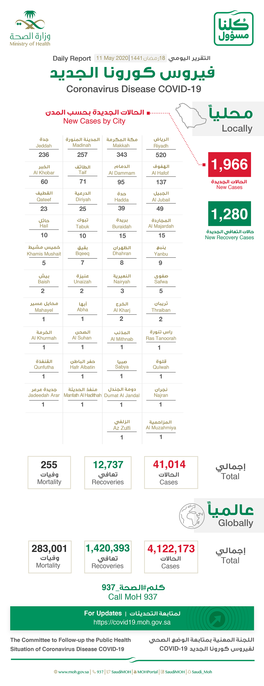 أعلنت وزارة الصحة، عن تسجيل 1966 إصابة جديدة بفيروس «كورونا» خلال يوم الأحد «العاشر من مايو 2020م»، ليصل إجمالي الإصابات بالفيروس إلى 41014 إصابة، منهم 38% مواطنين و62 % أجانب، وبلغ عدد الحالات الحرجة 149 حالة يتلقون العلاج في غرف العناية المركزة بالمستشفيات.