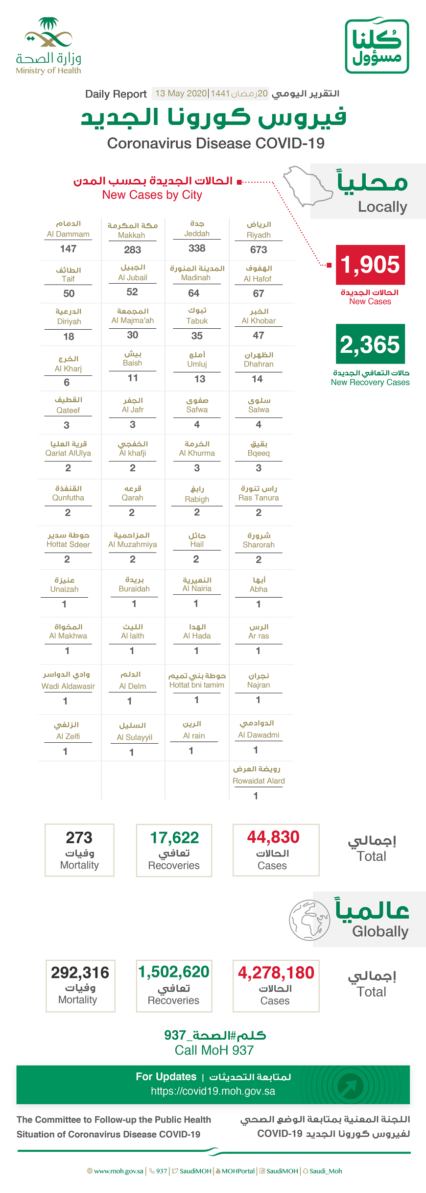 أعلن المتحدث الرسمي لوزارة الصحة الدكتور محمد العبدالعالي، الأربعاء «13 مايو 2020م»، عن تسجيل «1905» إصابة جديدة، ليصل إجمالي الإصابات وصل إلى 44830 حالة، وعدد الحالات النشطة 26935 حالة منها 147 في حالة حرجة.