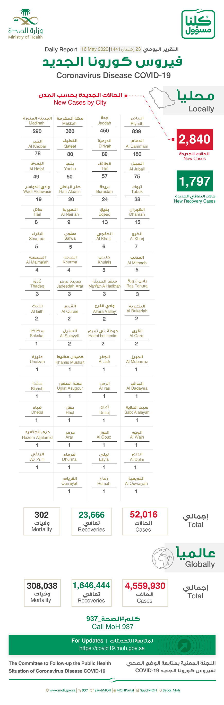 أعلنت وزارة الصحة، السبت «16 مايو 2020م»، عن تسجيل 2840 إصابة جديدة بفيروس «كورونا» خلال يوم أمس «الجمعة»، ليصل إجمالي إصابات كورونا إلى 52016 إصابة، منهم 34% مواطنين، و66% أجانب، وبلغ عدد الحالات الحرجة 166 حالة يتلقون العلاج في غرف العناية المركزة بالمستشفيات.