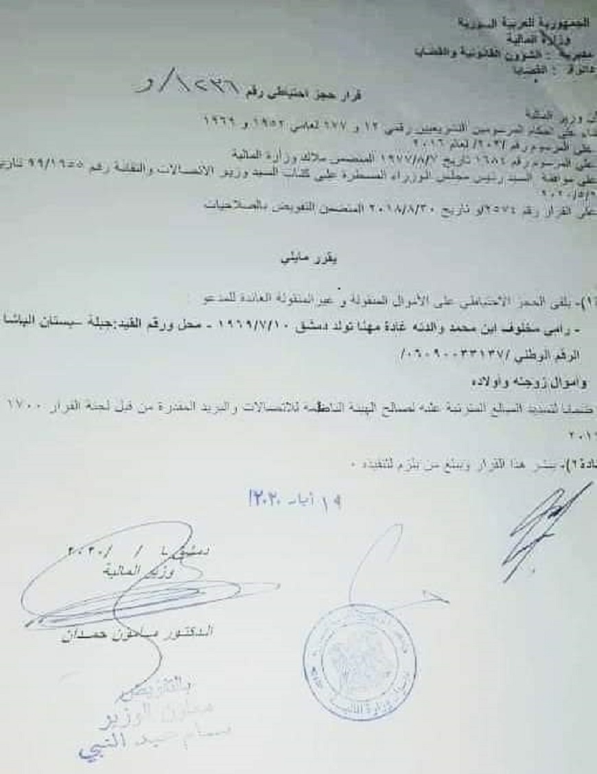 وجاء في القرار الصادر عن وزير المالية، أنه الحجز الاحتياطي قد ألقي على الأموال المنقولة وغير المنقولة العائدة للمدعو رامي مخلوف، ضماناً لتسديد المبالغ الترتبة عليه لصالح الهيئة الناظمة للاتصالات والبريد المثدرة من قبل لجنة القرار 1700 / 2019، بحسب البيان.