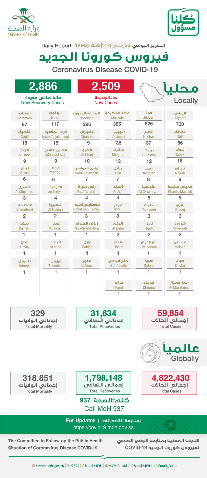 أعلنت وزارة الصحة، عن تسجيل 2509 إصابات جديدة بفيروس كورونا خلال يوم الاثنين «18 مايو 2020م»، ليصل إجمالي الإصابات بالفيروس إلى 59854 إصابة، منهم 35% من المواطنين و65% أجانب، وبلغ عدد الحالات الحرجة 251 حالة يتلقون العلاج في غرف العناية المركزة بالمستشفيات.