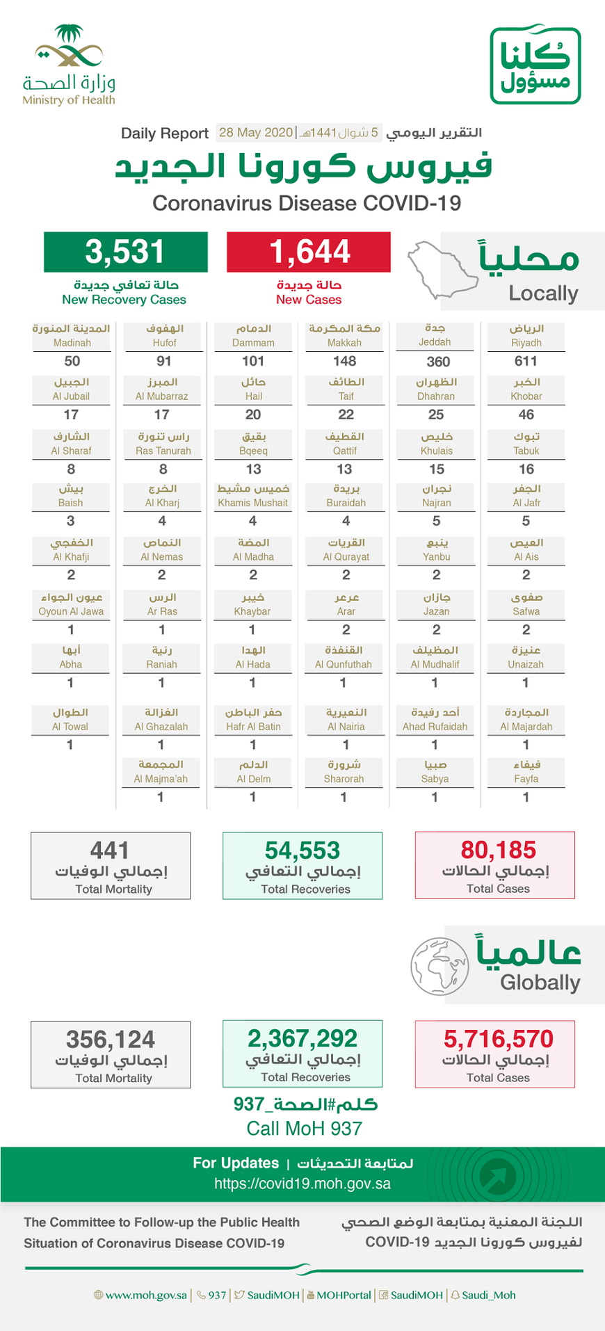 وكشفت عن تسجيل 3531 حالة تعافٍ، ليصبح إجمالي عدد الحالات المتعافية 54553 حالة ـ ولله الحمد ـ.