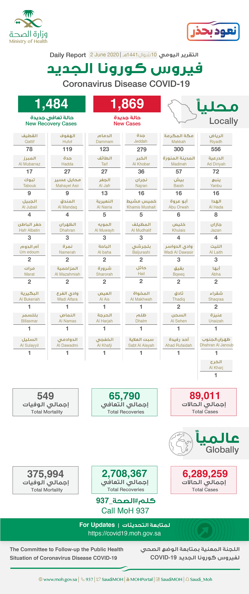 أعلنت وزارة الصحة، الثلاثاء «الثاني من يونيو 2020»، عن تسجيل 1869 إصابة جديدة بفيروس كورونا الجديد «كوفيد-19» ليصبح الإجمالي 89011 حالة.