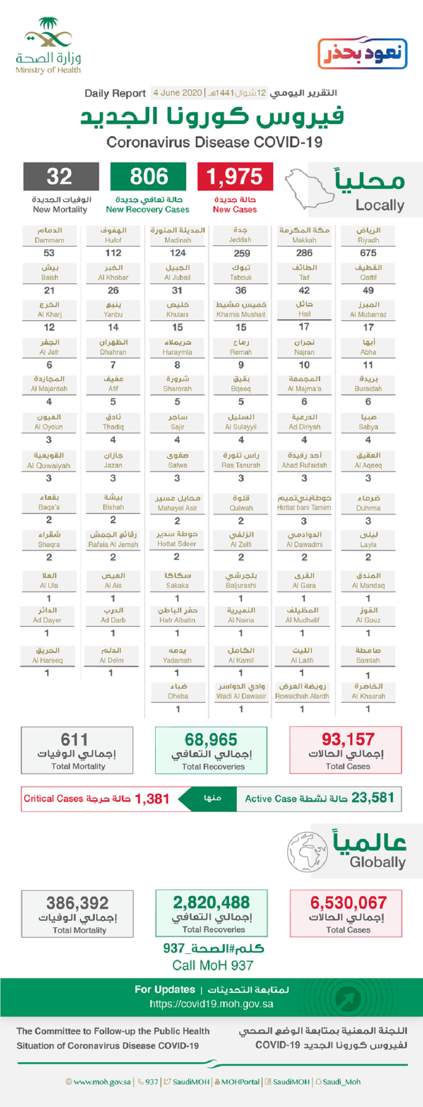 أعلنت وزارة الصحة، الخميس «الرابع من يونيو 2020»، تسجيل 1975 حالة إصابة جديدة بفيروس كورونا الجديد (كوفيد-19) ليصبح الإجمالي 93157 حالة .