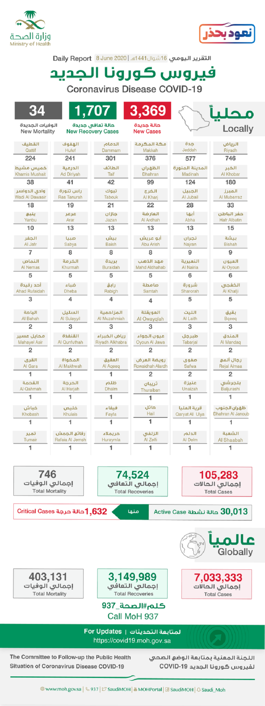 أعلنت وزارة الصحة، الاثنين «الثامن من يونيو 2020»، عن تسجيل 3369 حالة إصابة جديدة بفيروس كورونا الجديد (المستجد «كوفيد-19» ليصبح الإجمالي 105283 حالة بالمملكة. بينما سجلت المنطقة الشرقية 1170 إصابة بوباء كورونا.