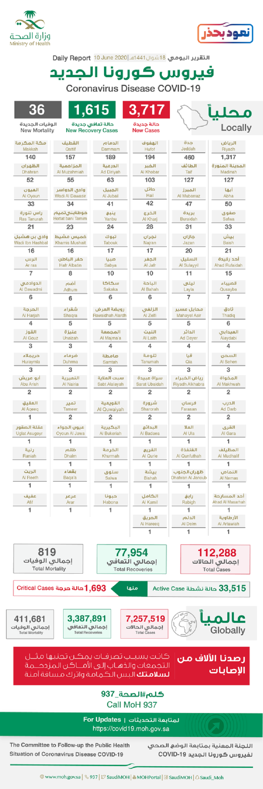 أعلنت وزارة الصحة، الأربعاء «العاشر من يونيو 2020م»، عن تسجيل 3717 إصابة جديدة بفيروس كورونا، ليرتفع العدد الإجمالي للإصابات بالمملكة إلى 112288، منها 33518 حالة نشطة، بينها 1693 حالة حرجة في العناية المركزة.