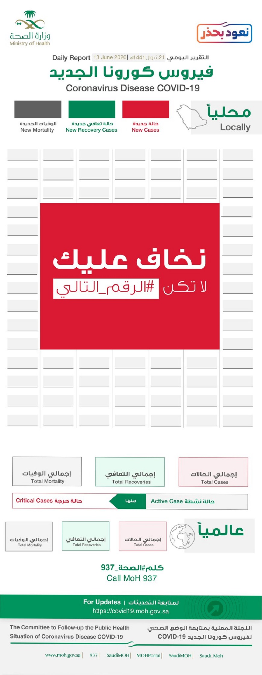 وكشفت الوزارة، عن 1519 حالة تعافي ليرتفع إجمالي المتعافين لـ82548 حالة شفاء كما تم تسجيل 39 حالة وفاة ـ رحمهم الله ـ ليرتفع إجمالي الوفيات لـ932 حالة.