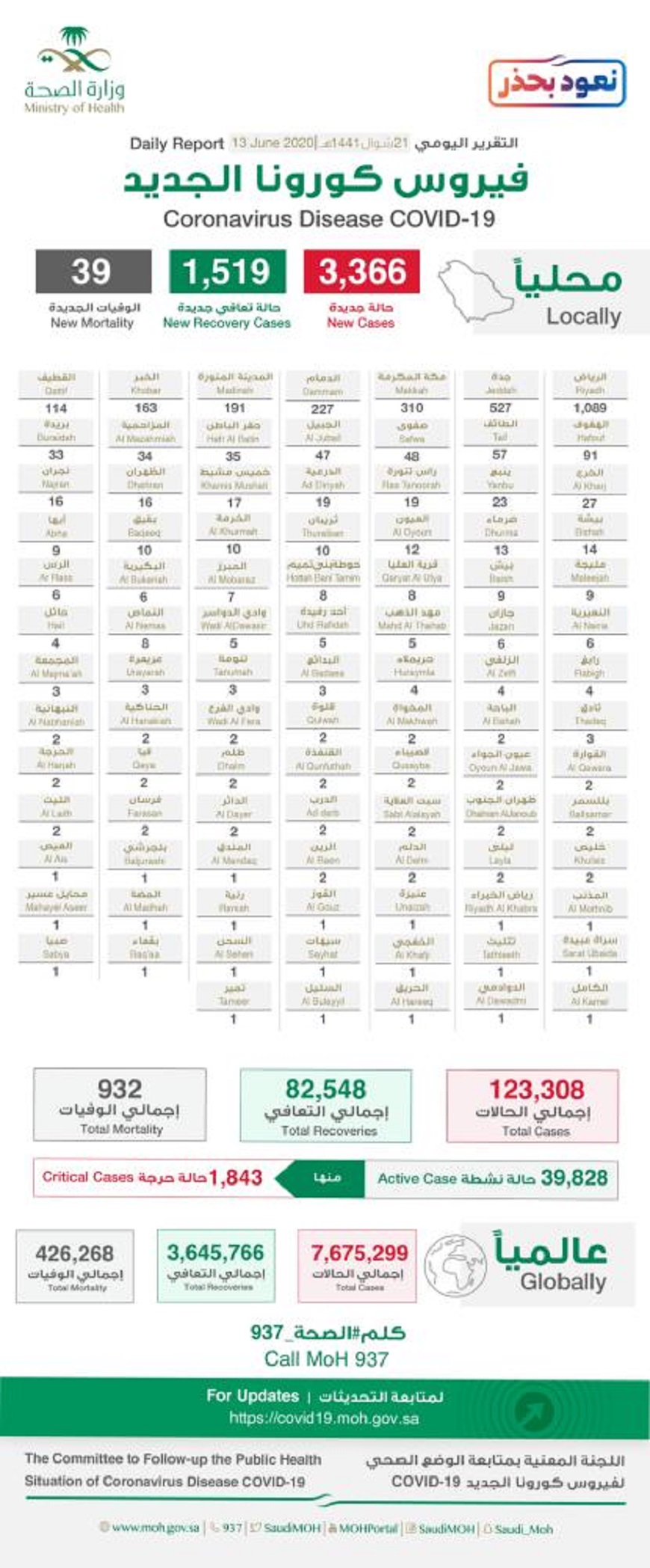 أعلنت وزارة الصحة، السبت «13 يونيو 2020»، تسجيل 3366 حالة إصابة جديدة بفيروس كورونا الجديد (كوفيد-19) ليصبح الإجمالي 123308 حالة.