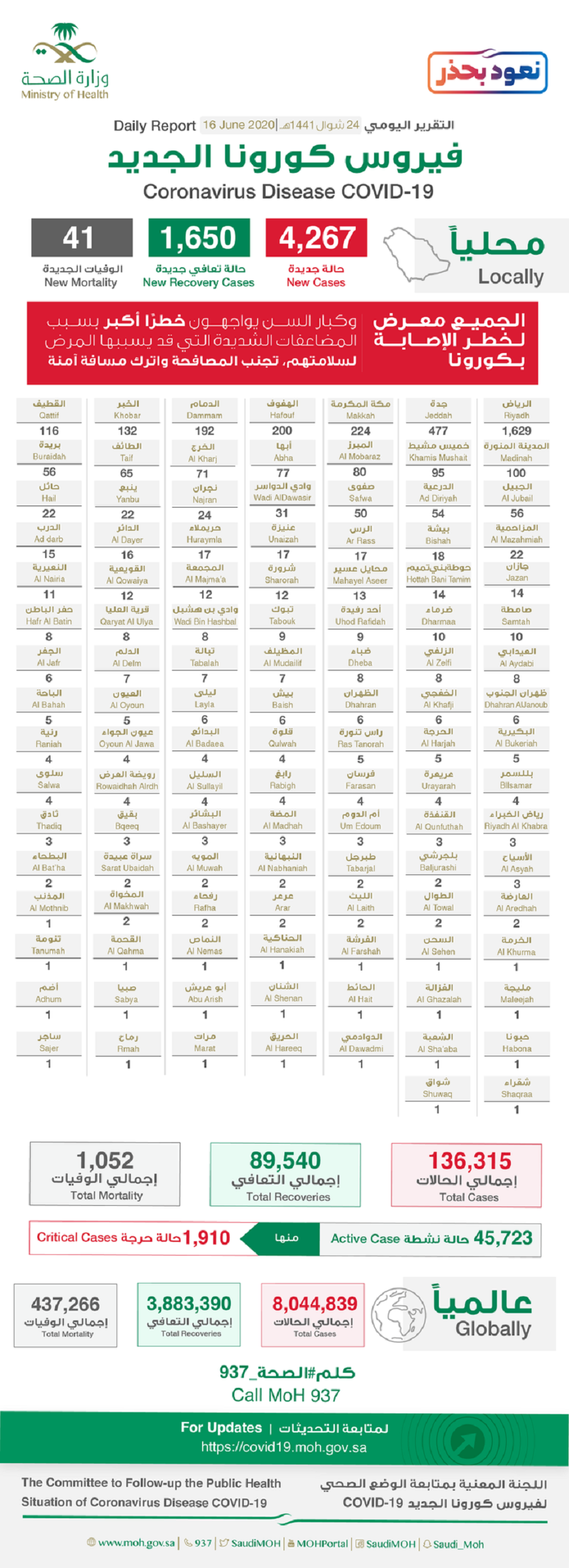 وكشفت الوزارة عن تسجيل 1650 حالة تعافي جديدة ليصبح إجمالي حالات الشفاء 89540 حالة كما تم تسجيل 41 حالة وفاة ـ رحمهم الله ـ ليصبح إجمالي الوفيات جراء الفيروس 1052 حالة .
