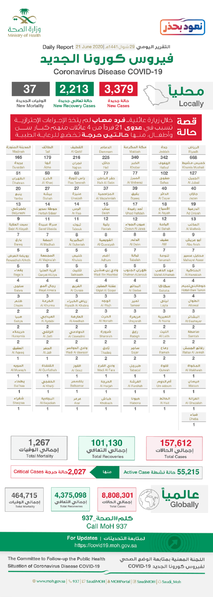 أعلنت وزارة الصحة، الأحد «21 يونيو 2020»، عن تسجيل 3379 حالة إصابة جديدة بفيروس كورونا الجديد «كوفيد-19» ليصبح الإجمالي 157612 حالة.