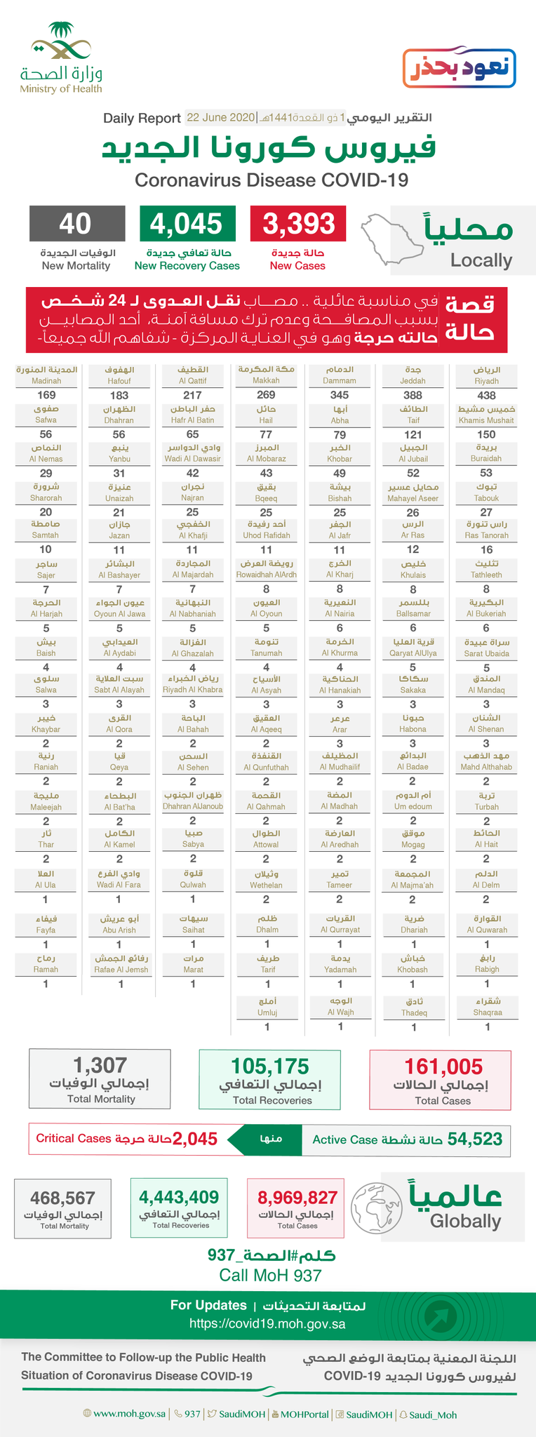 أعلنت اليوم وزارة الصحة، تسجيل 3393 حالة إصابة جديدة بفيروس كورونا الجديد (كوفيد-19) ليصبح الإجمالي 161005 حالة .