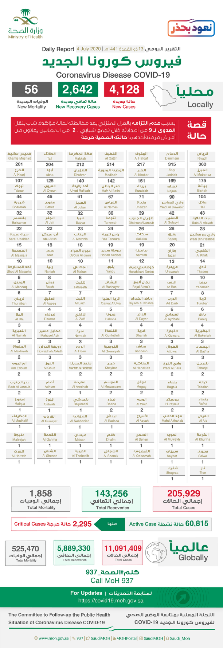 أعلنت وزارة الصحة، السبت «الرابع من يوليو 2020»، تسجيل 4128 حالة إصابة جديدة بفيروس كورونا الجديد «كوفيد-19» ليصبح الإجمالي 205929 حالة.