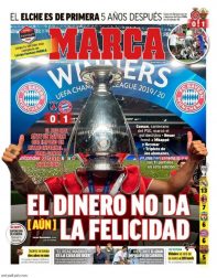 عنونت “ماركا” الإسبانية صفحتها الرئيسية بعنوان: “الأموال لا تجلب السعادة”, جاء ذلك بعد خسارة باريس سان جيرمان أمام بايرن ميونيخ في نهائي دوري أبطال أوروبا، سهرة الأحد “٢٣ أغسطس ٢٠٢٠”.