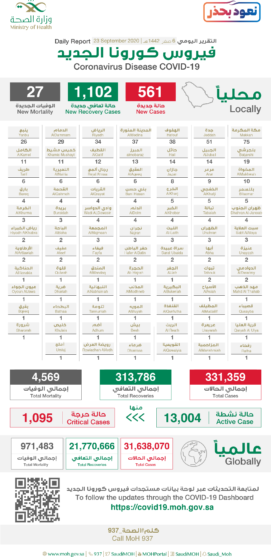 أعلنت وزارة الصحة، الأربعاء «23 سبتمبر 2020»، تسجيل 561 حالة إصابة جديدة بفيروس كورونا الجديد «كوفيد-19» ليصبح الإجمالي 331359 حالة .