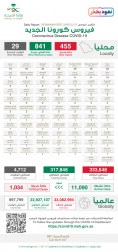 وقالت الوزارة أنه تم تسجيل 841 حالة تعاف جديدة ليصبح الإجمالي 317846 حالة ولله الحمد.